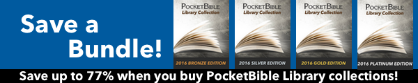 When you are ready to expand your PocketBible library, use the in-app store or visit us here to purchase additional Bibles or books at any time. We offer popular Bible translations such as NIV, ESV, NLT, and NKJV. And popular books such as Life Application Study Bible, MacArthur Study Bible, NIV Study Bible, Bible Knowledge Commentary, Vine's Expository Dictionary, Bible Maps, My Utmost for His Highest, and many more.