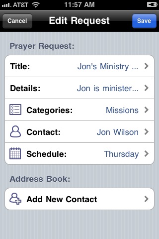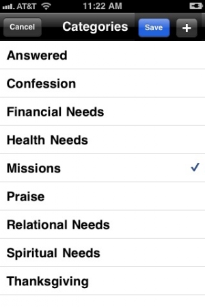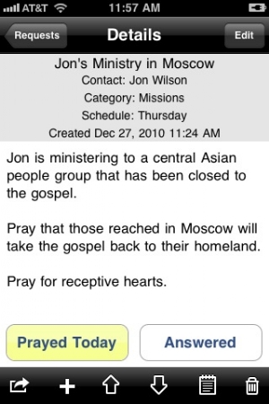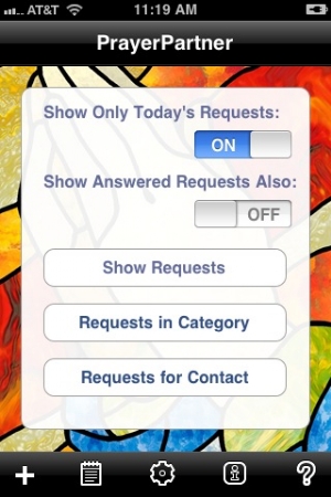 PrayerPartner maintains lists of prayer requests, keeping track of which ones have been answered, which ones you'd like to pray for today, and which ones have already been prayed for today. Each request can be categorized, associated with a contact from your Contacts Address Book, and scheduled to be prayed for daily, on certain days of the week, or certain days of the month.