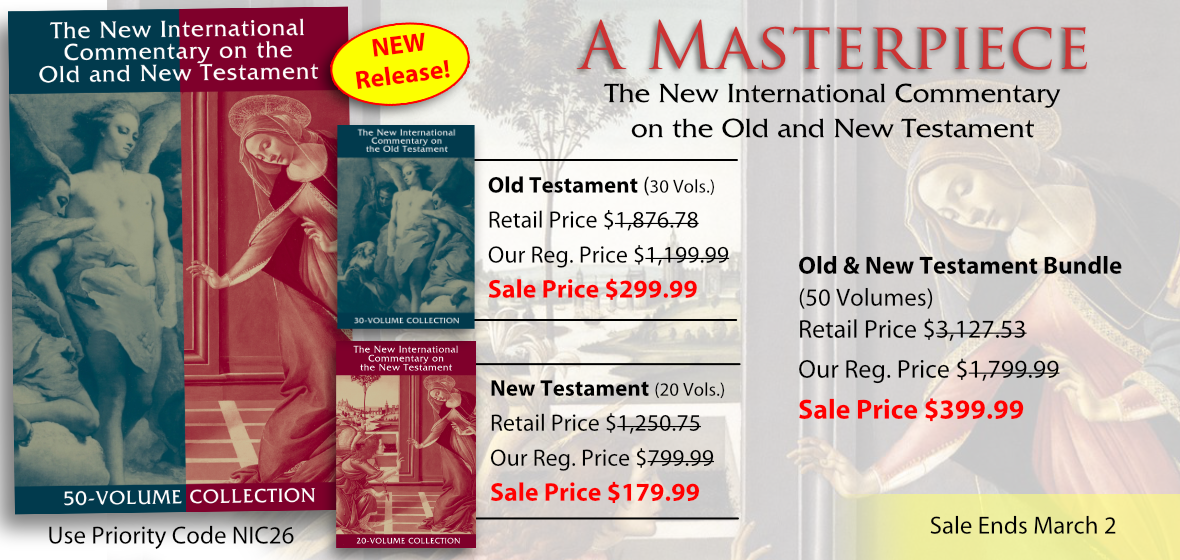 Introducing the New International Commentary on the Old and New Testaments, regularly $1799.99, your price today is $399.99. Or choose the OT volume, regularly $1199.99, for $299.99, or the NT volume, regularly $799.99, for $179.99.